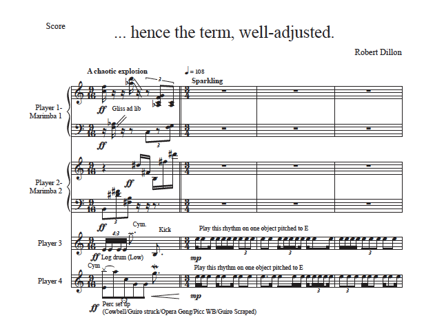 Watch TCP's performance on YouTube:"…hence the term, well-adjusted" (2017-2020) is scored for two marimbas (5.0 and 4.3 octave) and two small percussion set-ups. The performers must find their own collection of sounds pitched to a single note (E-natural). The unique combination of sounds forms the starting point for the piece, which progresses into a series of different directions, always resetting to the opening before proceeding down a new path.